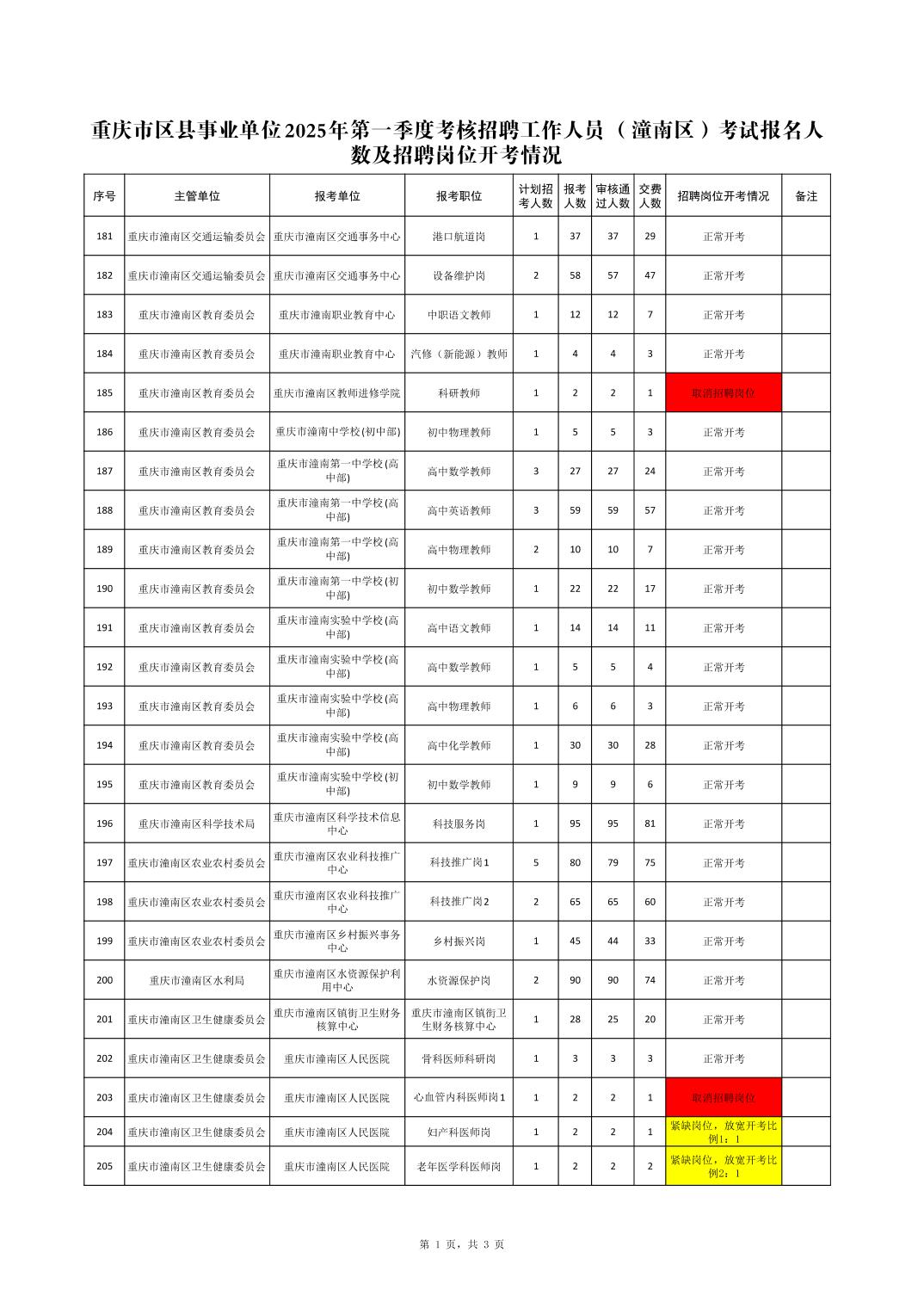 原標題:重慶市區縣事業單位2025年第一季度考核招聘工作人員(潼南區)考試報名人數及招聘崗位開考情況