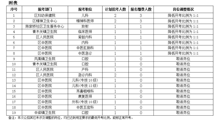 按照2020年9月3日發布的《沙坪壩區2020年下半年公開招(選)聘事業單位工作人員簡章》中“未達到筆試開考比例情形的處理”有關規定,根據本次招聘各崗位報名確認情況,崗位需求及人才緊缺程度,經有關用人單位及主管部門研究,并報市級事業單位人事綜合管理部門備案,現對有關崗位的招聘名額進行調整(詳見附表)。