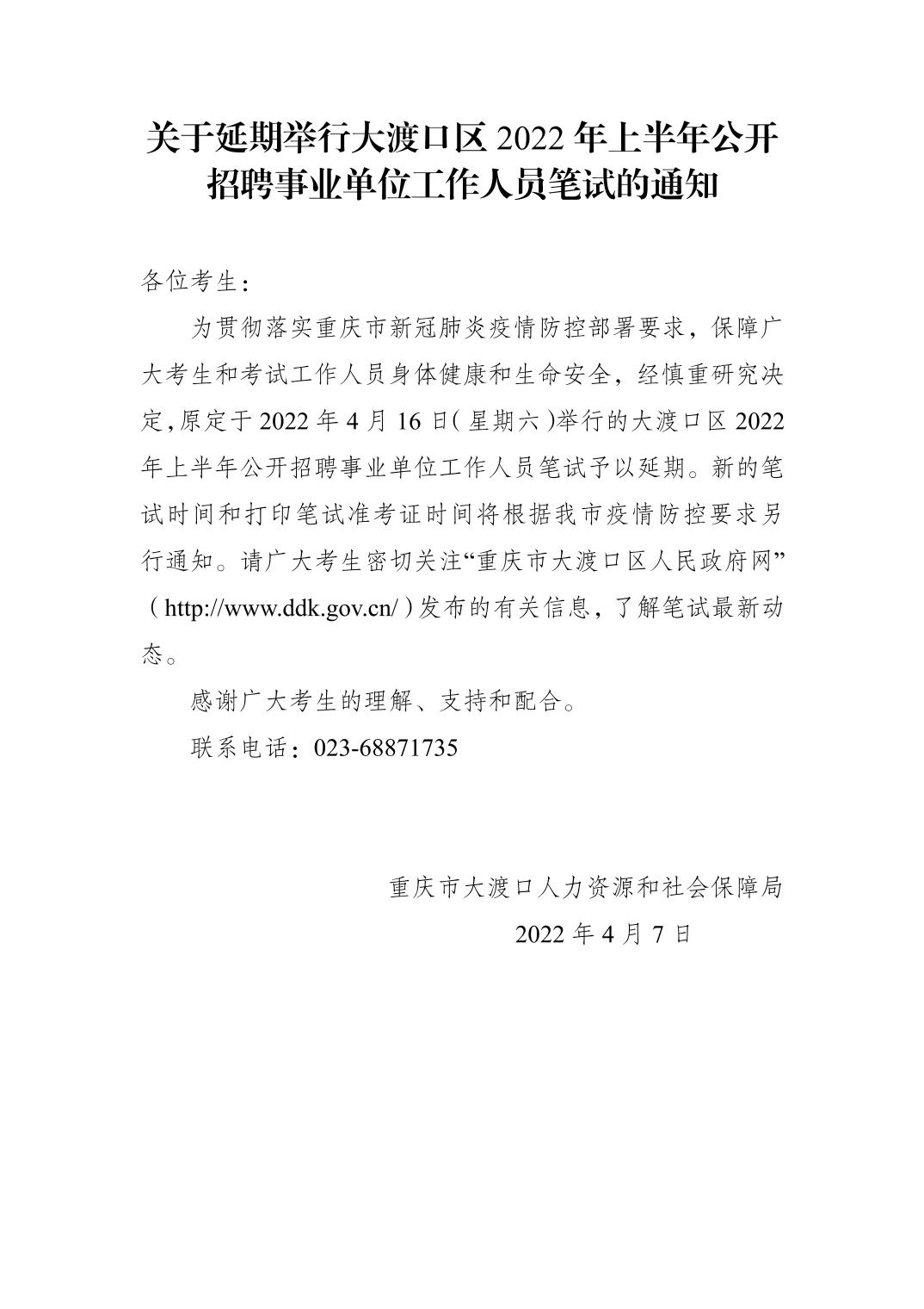2022年上半年重慶大渡口區公開招聘事業單位工作人員筆試延期的通知