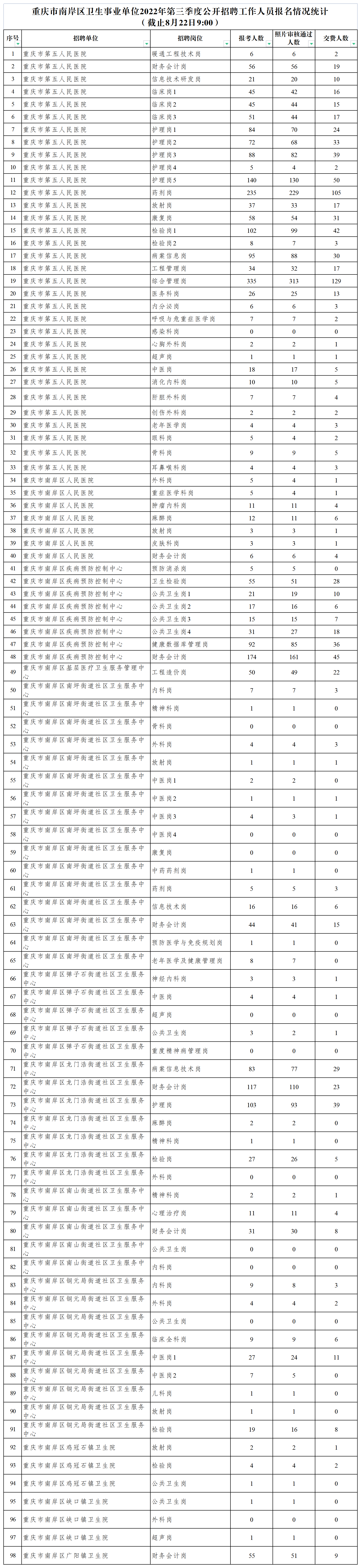 原標題:重慶市南岸區衛生事業單位2022年第三季度公開招聘工作人員報名情況統計(8月22日)