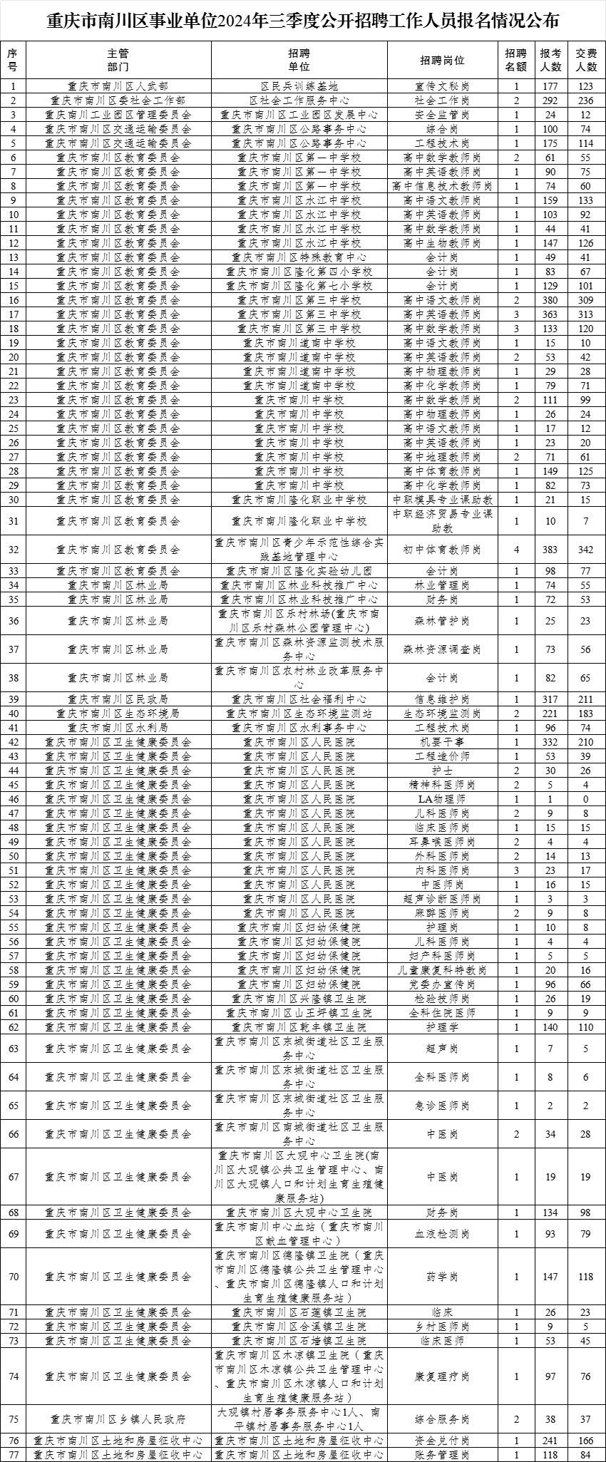 原標題:重慶市南川區事業單位2024年三季度公開招聘工作人員報名情況公布