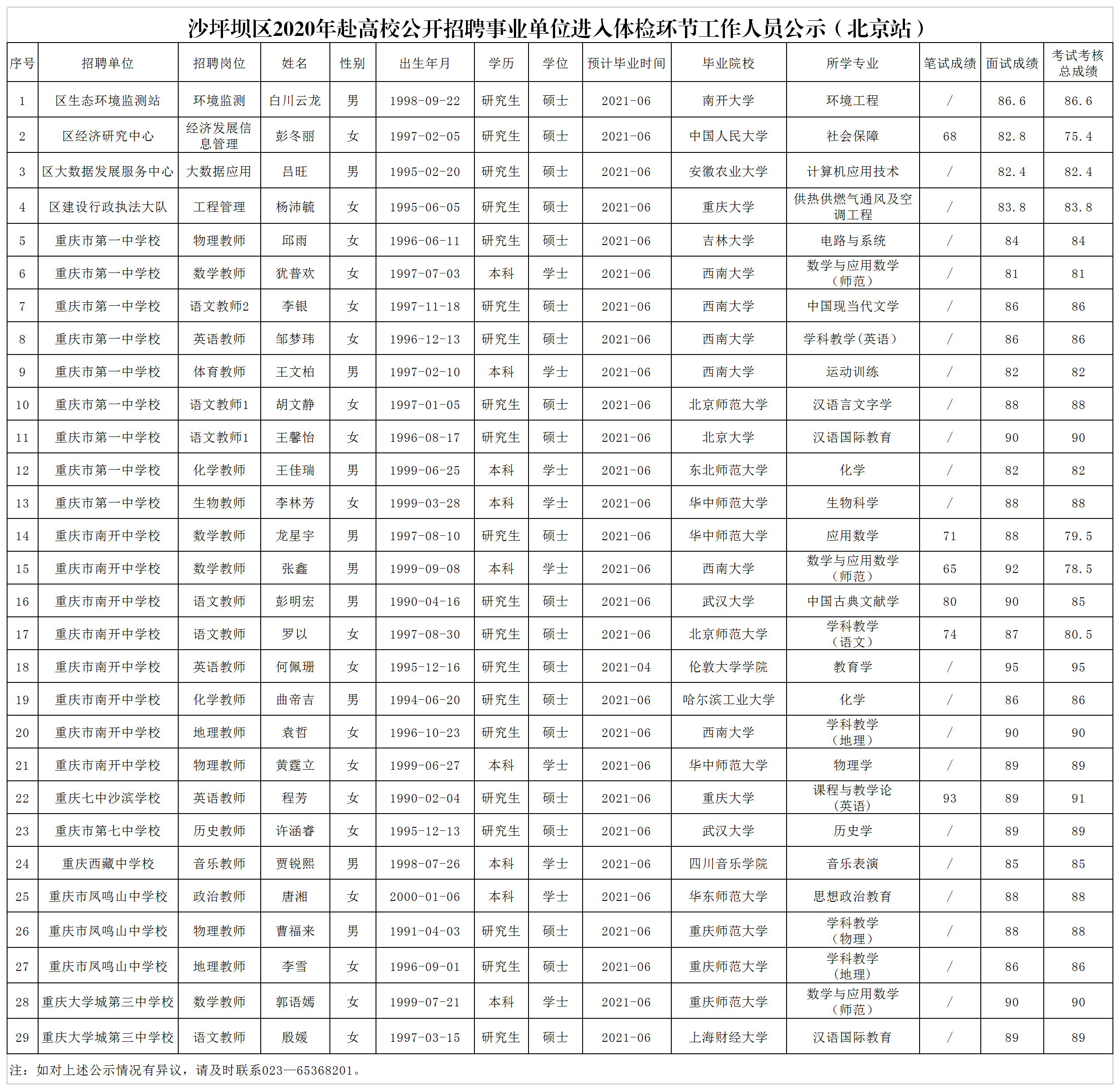 【導語】2020年沙坪壩赴高校公開招聘事業單位進入體檢環節工作人員公示公告現已發布,新公教育 為廣大考生整理此次公告內容如下,望各位考生及時查看切勿錯過報名時間。新公教 育為報考重慶事業單位考生提供備考資料、輔導用書、真題講義、筆試課程等內容, 歡迎各位考生加入備考QQ群 663261430一起學習!