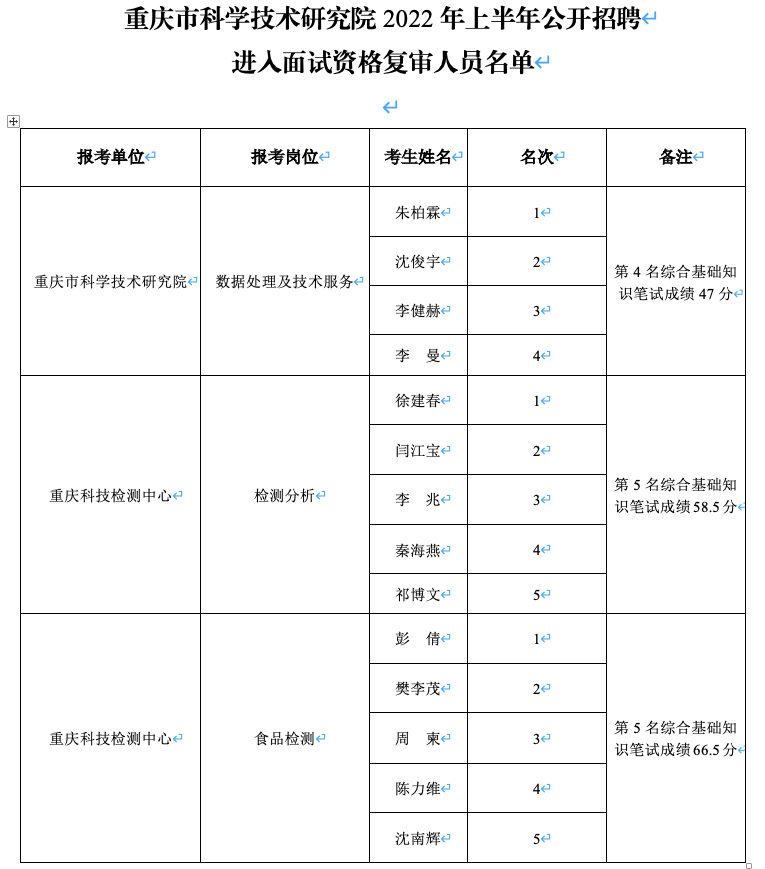 原標題:重慶市科學技術研究院2022年上半年公開招聘 進入面試資格復審人員名單公示