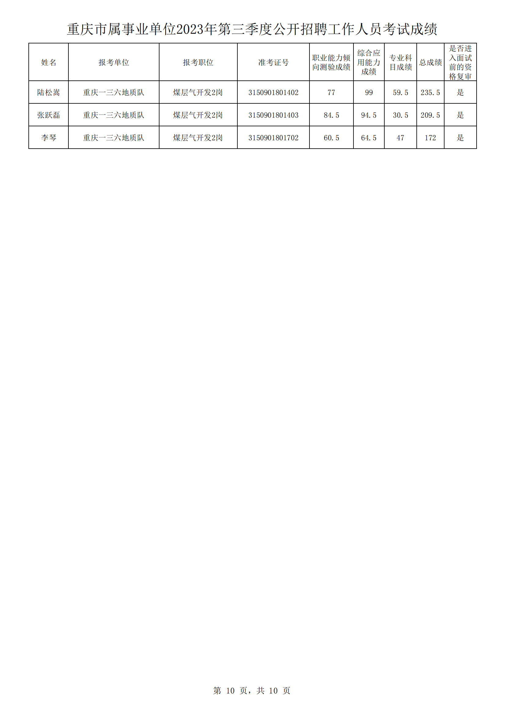 原標題:重慶市地質礦產勘查開發局2023年第三季度公開招聘事業單位工作人員面試資格復審人員名單公共科目筆試和專業科目測試成績公示