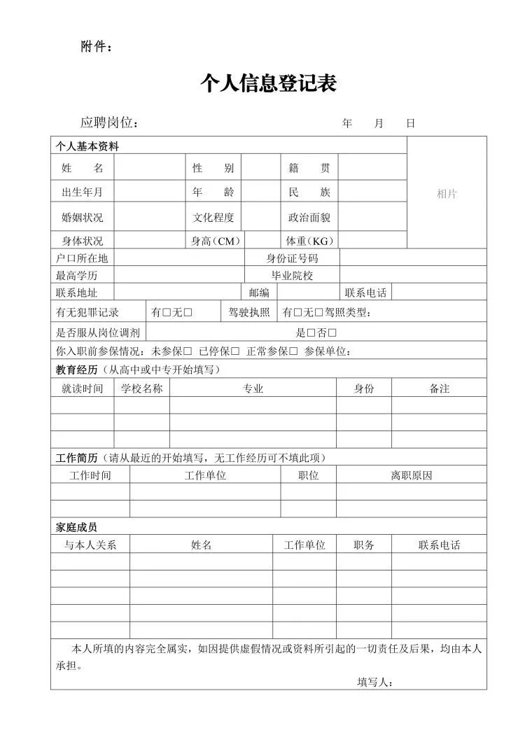 3.資格審查所需材料:個人信息登記表(見附件),本人近期1寸彩色免冠照片5張、身份證原件及復印件2份、本人戶口簿原件及復印件1份(主頁、個人頁、增減頁)、畢業證原件及復印件1份、本人學信網學歷認證證明1份、相關資格認證證書原件和復印件各1份,個人征信報告1份(需攜帶本人身份證前往人民銀行開具個人征信報告,若個人征信報告有較為嚴重的個人不良信用記錄,將作不合格處理),退役軍人需出具《退役證》等相關證明文件。