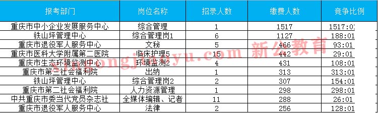 重慶事業(yè)單位考試網(wǎng)為大家整理了本次考試?yán)U費(fèi)人數(shù)最多的前十崗位。排在第一的是重慶市中小企業(yè)發(fā)展服務(wù)中心的綜合管理崗,已有1517人交費(fèi),此崗位僅招考一人,因此競爭壓力較大。其他幾個(gè)崗位報(bào)名情況如下: