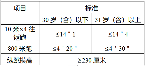 男子1000米跑、女子800米跑兩個項目的測評次數為1次,10米×4往返跑的測評次數不超過2次,縱跳摸高的測評次數不超過3次。