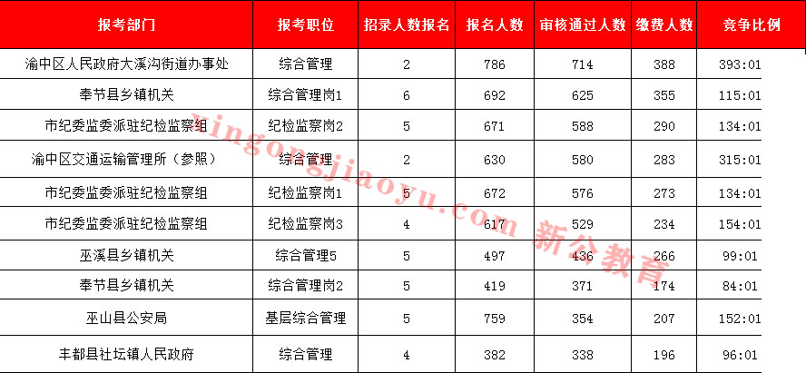 渝中區(qū)人民政府大溪溝街道辦事處-綜合管理崗位是目前過審人數(shù)最多的崗位,過審率高達90.8%,同時其競爭比例也是最高的,另一個渝中區(qū)的崗位其競爭比例也位于前五。奉節(jié)縣鄉(xiāng)鎮(zhèn)機關(guān)-綜合管理崗1今日過審人數(shù)排在第二,過審率90.3%,該崗位雖然報名人數(shù)近七百,但招錄指標較多,因而競爭壓力相較而言不算太高??梢钥吹降氖?,在過審人數(shù)前十的崗位中,除了渝中區(qū)的兩個崗位外,報名人數(shù)皆比較多,但同時這些崗位招錄人數(shù)也較多,因而競爭壓力相對而言較小。小編提醒還未報考的考生,可以多關(guān)注下競爭壓力較小的崗位,理性選擇崗位。