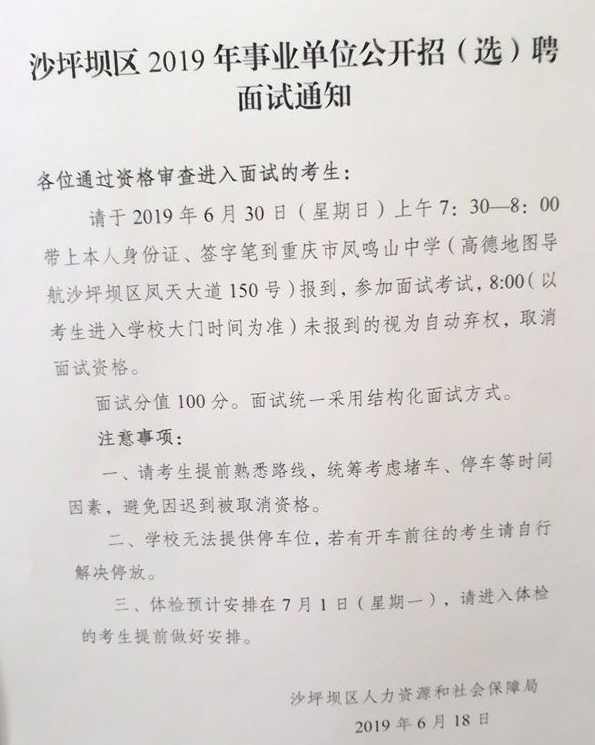 沙坪壩事業單位面試時間:6月30日(星期日)上午7:30-8:00報道,報道地址:重慶市鳳鳴山中學,體檢安排在7月1日(星期一)。